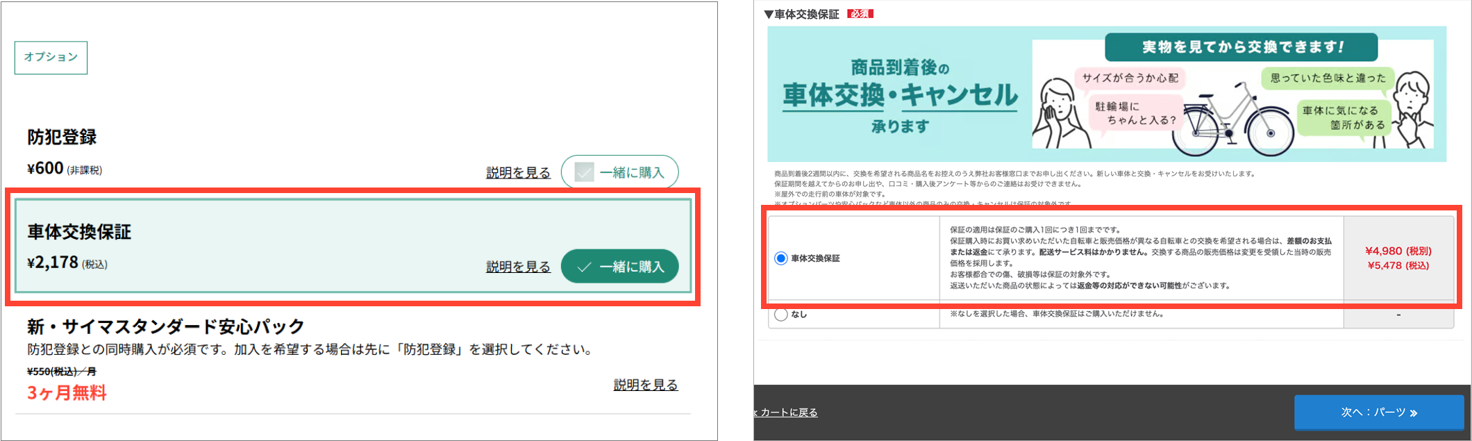 自転車購入時に商品ページもしくはカートでチェックを入れるだけでお申込みできます。