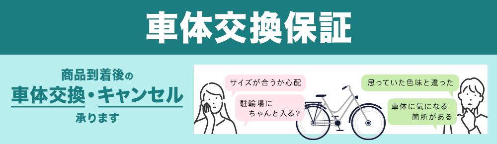 - 保証購入時にお買い求めいただいた自転車と販売価格が異なる自転車との交換を希望される場合は、差額のお支払または返金にて承ります。配送サービス料はかかりません。交換する商品の販売価格は変更を受領した当時の販売価格を採用します。