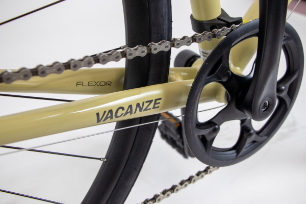 VACANZE 2をベースに天候に左右されにくく安定した高い制動力を持つ機械式ディスクブレーキを標準搭載。変速ギアはリアのみ7段変速ですが街乗りには十分のスペック。日常使用には必須なキックスタンドを標準装備し、ディスクブレーキ化に伴いホダカ社のパーツブランド「P&P COMPONENTS」の「WH-A1800RD」ホイールを搭載。各ブラックパーツとホイールのブラックリムが合わさり精悍なルックスを実現しています!※2023年8月~車輪の固定方法がクイックリリースタイプからスキュワータイプ(六角レンチ固定)に変更となります。一定期間旧仕様と新仕様が混在いたしますがお選びいただくことは出来ませんので予めご了承ください。