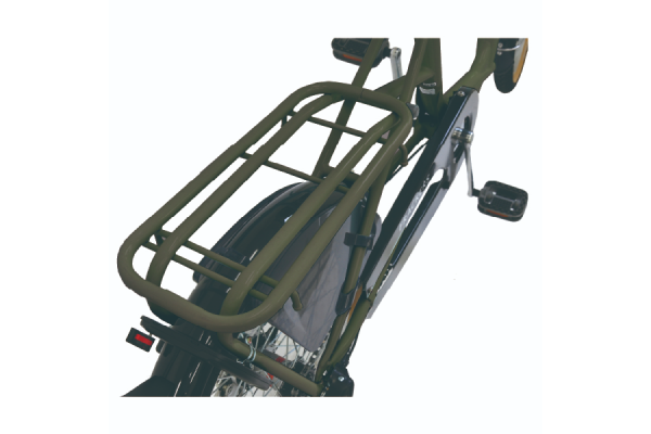 広くて長い大きなパイプキャリアはフレーム形状にあわせて設計。リヤチャイルドシートを取り付けてもしっかり支えられ、小径モデルで発生してしまう重心不安定のための前輪持ち上がりも防止します。