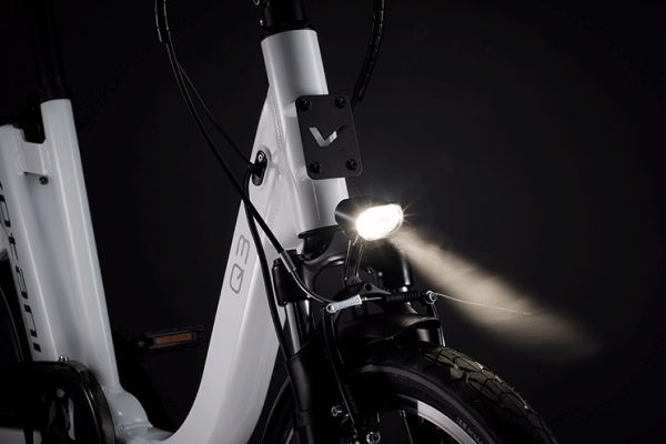 標準装備のフロントライトは、バッテリーからの給電で、夜道をしっかりと照らします。フロントキャリア装着時には、取付位置の変更ができます。
