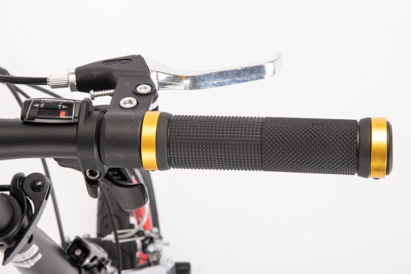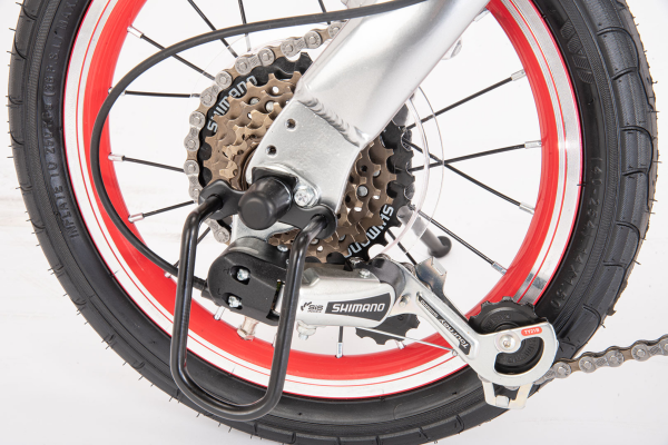 フォルクスワーゲン車の一部モデルに採用される印象的なレッドをほうふつさせる赤リム。また変速機を守るためのディレーラーガード付き。