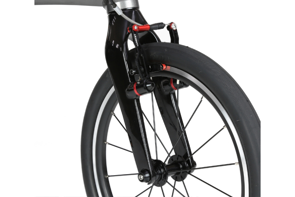 フォークコラムまでカーボン素材を使用したフルカーボンフロントフォーク。ブレーキはVブレーキなのでしっかり止まれます。