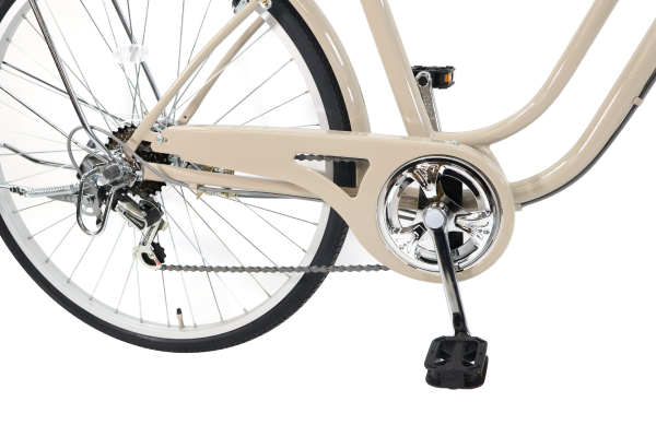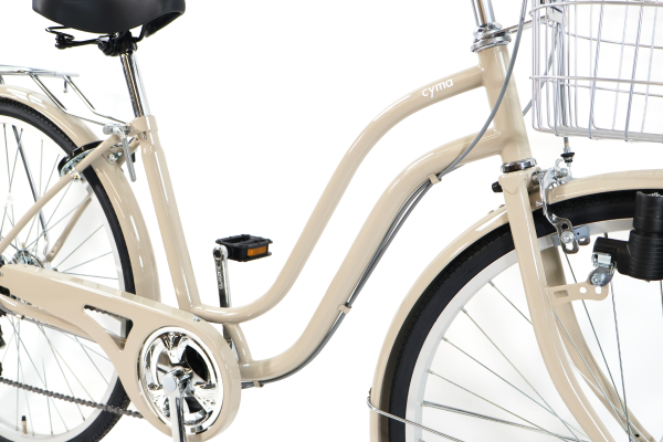 シンプルなデザインで万人にオススメなcymaオリジナルシティサイクルのベーシックモデルが新登場!機能を調整しお買い求めしやすい価格を実現しました。デザイン面では細身のS字型フレームでシンプルかつまたぎやすさを実現。機能面ではオートライトではございませんが、明るく低負荷なLEDダイナモを採用し明るく夜道も旧来の豆電球ダイナモほど負荷はありません。リング錠には防犯性の高いディンプルキータイプを装着。お買い物に便利な大きめのカゴ。坂道から平坦な道まで状況に合わせて最適なギアを選べる外装6段変速、駐輪時の安定性が高い両足スタンドなど日常生活での使いやすさにもこだわりました。