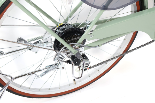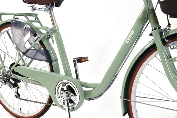 ステンレスパーツを多用した高耐久な仕様。高価になりそうなパーツ構成ですが、cymaオリジナル自転車ならではのお買い求めしやすい価格を実現しています。乗り降りしやすいためチャイルドシートを搭載した仕様やシニア世代にもオススメです。