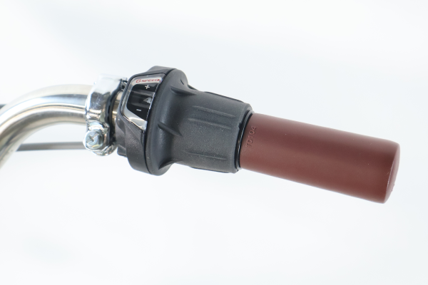 ハンドルを握ったままギアを変更できる、シマノ製のグリップシフトを採用。