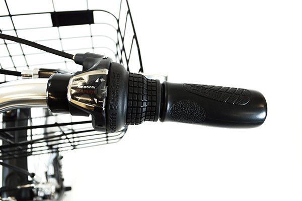 ハンドルを握ったままギアを変更できる、シマノ製のグリップシフトを採用。