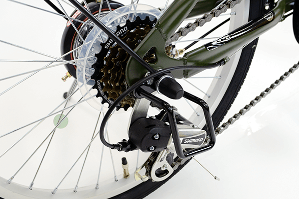 チェーンガード付チェーンリングにより、走行中のチェーンによる裾汚れを防ぎます。
