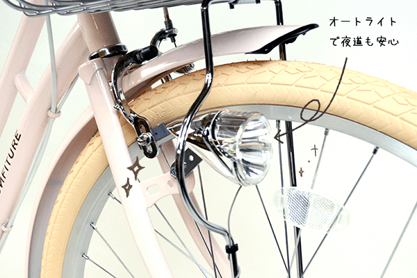 機能はバッチリフル装備なのに、めっちゃ可愛くてとても気に入りました。白いタイヤの自転車はまだ少ないので、すぐに自分の物と分かるのもいいです。安心の3年保険も付けて、注文してすぐに届いて古い自転車は引き取ってくれて、もう言う事なしです。