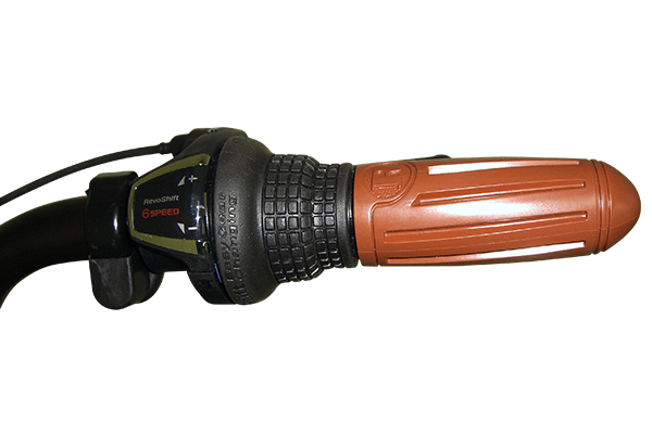 ハンドルを握ったままギアを変更できる、シマノ製のグリップシフトを採用