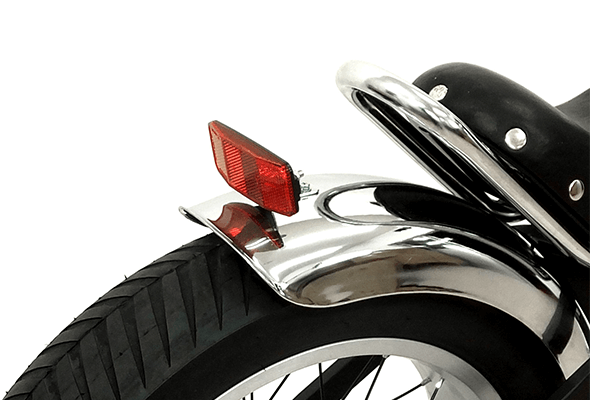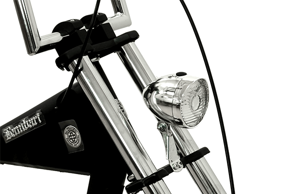 ハンドル部分に取り付けられたレトロな電池式ライト。