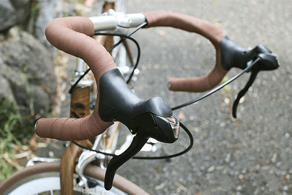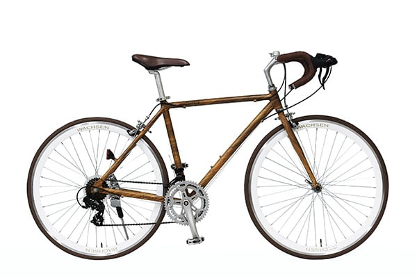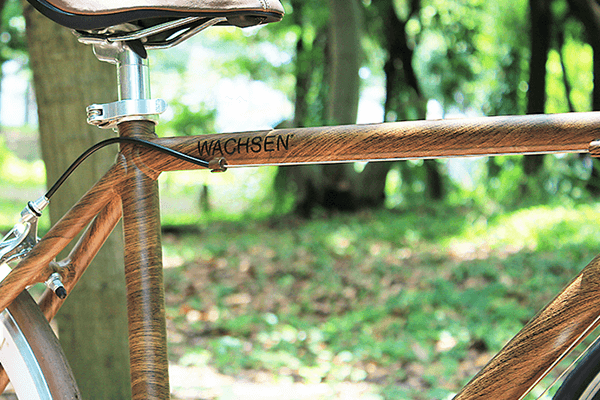 落ち着いた色合いの木目調のフレームがおしゃれなロードバイク。