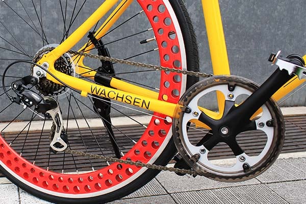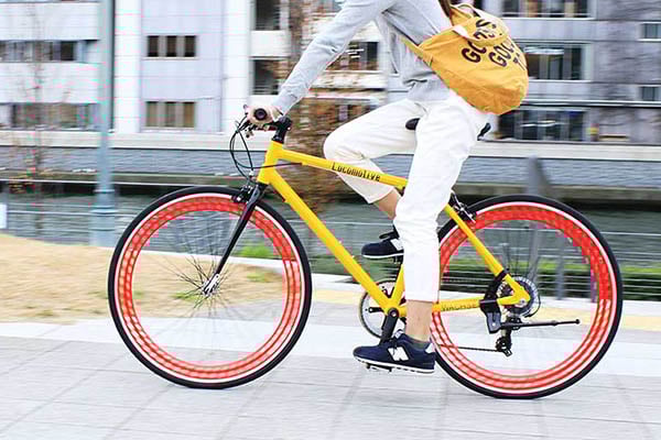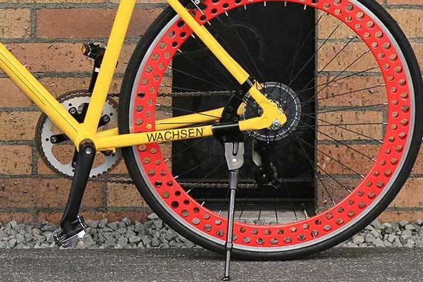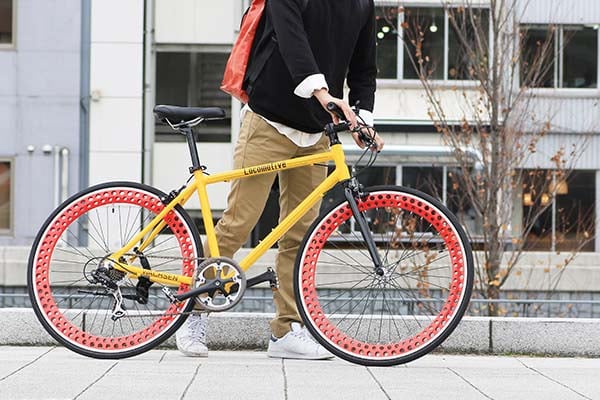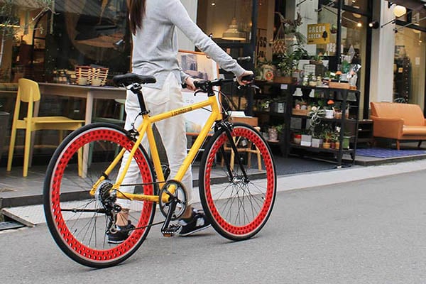 ネットの写真を見て一目で気に入り即、購入。ディープリムに穴あきのユニークな形状。その上、イエローのフレームにレッドのリムと目立つ色使いがいかにもおしゃれ。乗っているだけで楽しくなります。 車からの視認性は申し分なく安全性も高いでしょう。しっかりした組み上がりは乗っていて安心感があります。これだけ目立っていると、まず盗難には遭わないでしょう。ちょっとした街乗りに活用しています。