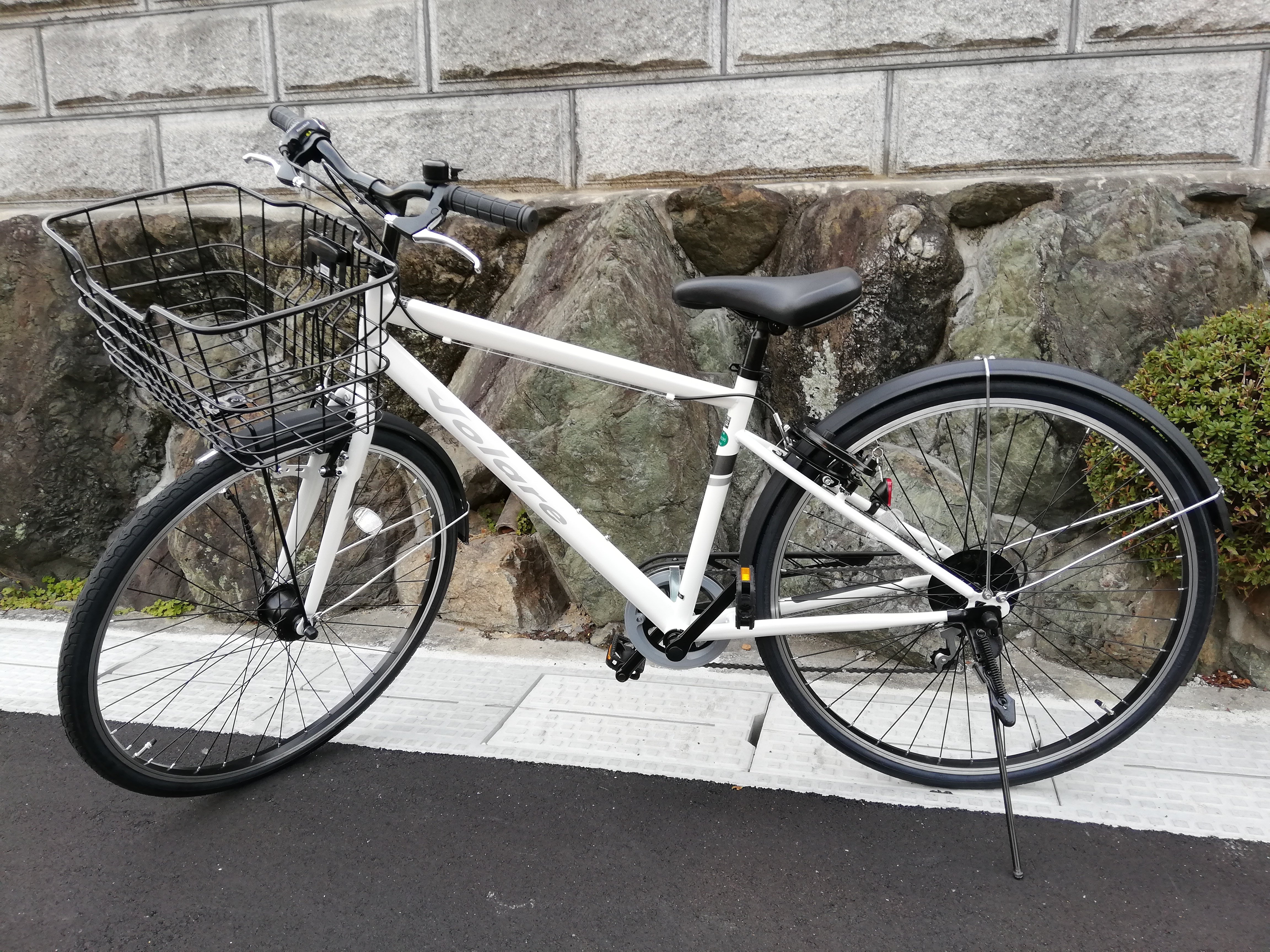 通勤にガッツリ使えるクロスバイク カゴ、チェーンカバー、泥除け完備でスーツで乗っても違和感ありません。