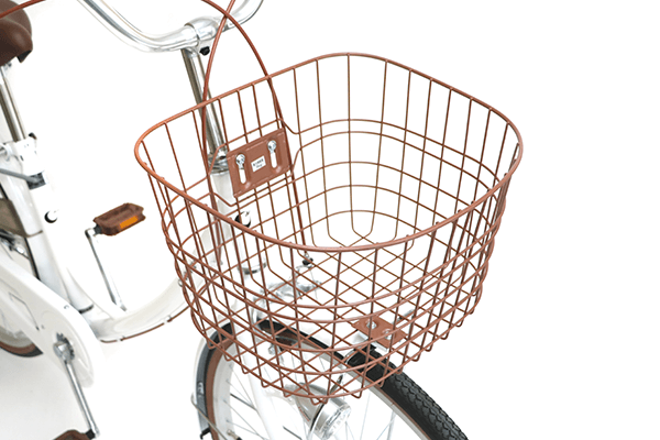 ブラウンカラーのおしゃれな前カゴを装備。角が丸いので荷物がひっかかりにくくなります。