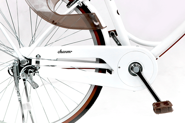 故障が少ないシングルギアと、厳選したパーツでトラブルに強いシティサイクルです。トラブルに強い理由のひとつが、チェーンカバー。チェーン全体を覆っているので、ロングコートやロングスカート、ワイドパンツなど、どんな服でも汚さずに乗ることができます。ドレスガードも広くてしっかりしているので、衣類が巻き込まれるのを防ぐのはもちろん、汚れがつくのも防いでくれます。また、LEDオートライトは付け忘れの心配がなく、明るさもばっちり。ローラーブレーキはとっても静かで長寿命なのが特徴。さらに嬉しいのは、低床設計のフレームなので、スカートでも乗り降りしやすいこと。シングルギアではありますが、乗りやすさや乗り心地の良さに関して嬉しい口コミもいただいています。