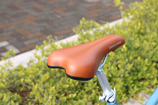 柔らかなブラウンのサドル。中央が窪み快適な走行を可能にします。