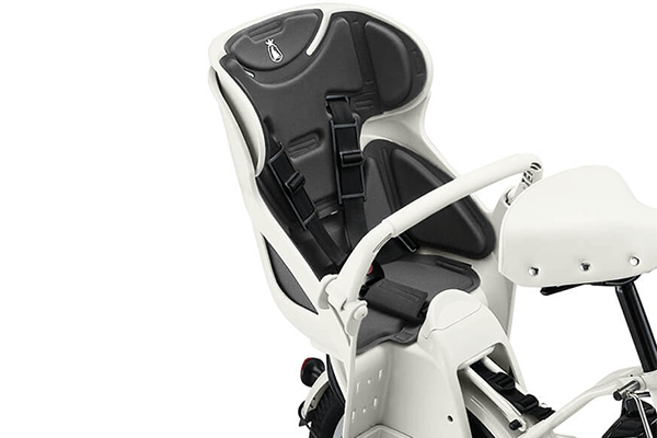 駐輪場で左右の自転車にぶつかりにくいスリムなデザイン。お子さまの成長に合わせて、背もたれの高さや足置きの位置を調整できます。