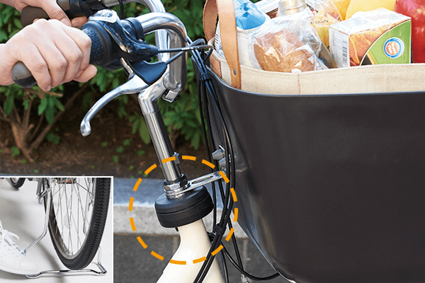スタンドを立てると同時にハンドルを固定して駐輪中の転倒を防ぎます。