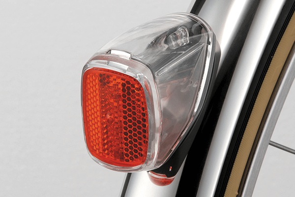 赤色のLEDを採用した、太陽充電型の自動点滅ライト。後ろからの視認性もアップ。(※年式により形状に軽微な差があります)