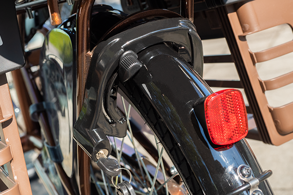 チャイルドシート取り付け時も操作しやすい後部取り付けタイプ。強度の高いシリンダ錠で防犯性も高い。(丸型バスケットモデル)