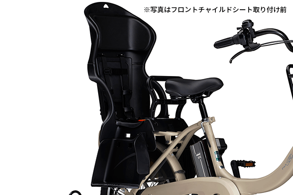 前チャイルドシートを追加し、お子様2人と一緒に乗れるタイプの Bubby un。前チャイルドシートを追加しても、特徴的な大きな前カゴはそのままだから、お子様をおふたり乗せても荷物をたっぷり入れることができ、お子様と一緒の時でもかばんや荷物を気にせず済むのがうれしいポイント。前チャイルドシートは、安全性に配慮してしっかり固定できるタイプを採用しています。