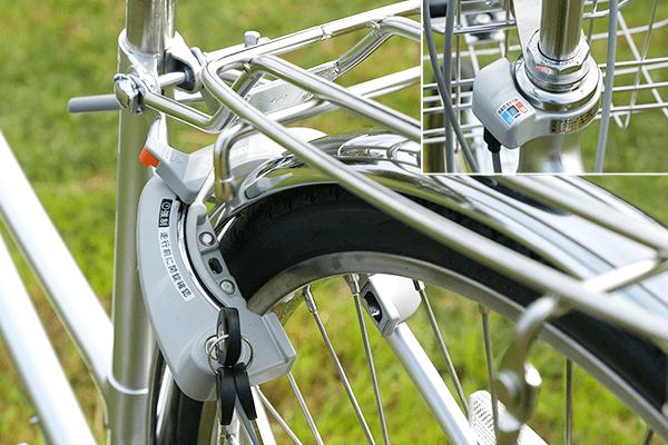 後輪錠を施錠でハンドルも同時にロック。盗難がされにくく、ふらつきも防ぐのでより安心です。