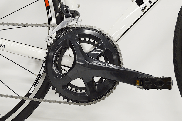 車体が引き締まるグロスブラックのシマノ「SORA」4アームクランク。