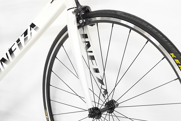 フォークブレード内側にも「INFIZA」ロゴを配置。タイヤサイズは700×25Cを採用。