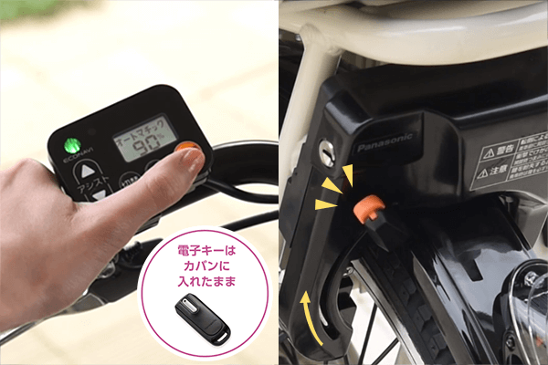 キーをカバンに入れたままでも、電源ONと同時に後輪サークルが自動開錠!