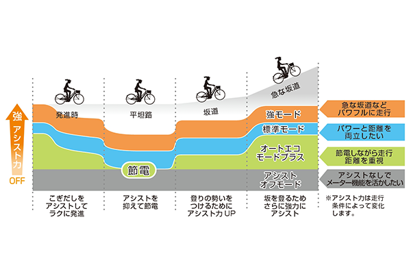 踏み込みがグッとアシストされ最初はビックリしましたが、慣れれば問題無いです。 電源入れる度にライトが点くので昼間は消すのを忘れないように…。