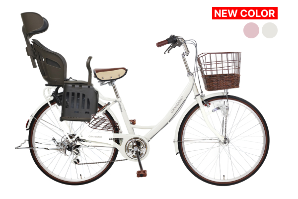 サイマでロングセラーのシティサイクル”グランディーノ”にチャイルドシートを搭載しました。サドルからグリップ、カゴまでブラウンで統一されたデザインであらゆるファッションに合うこと間違いなし。また、低床設計でかつドレスガードもついているので、乗り降りしやすく巻き込みも防止するので服装を選びません。さらに機能面ではLEDオートライトで夜でも安心、6段変速でお子様を乗せても走りやすい一台となりました。その上チャイルドシートは信頼のOGK製。ヘッドレストもついてお子様を安心して乗せられます。