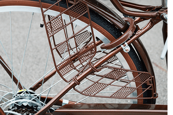 オシャレでかわいい前カゴ。目が細かく、小さいものが落ちにくいメリットも。新モデルでは上のワイヤー部もブラウンカラーになりよりオシャレになりました。