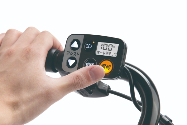 小型化、薄型化によりハンドル周りに馴染むスマートデザインのスイッチに。バッテリー残量、残り走行時間、残り走行距離を表示。オートライト機能も手元で簡単にon/off可能。2025モデルからはタイヤの変化量をモーターが推定し、空気の入れ時を「クウキチェック」と表示してお知らせしてくれます。