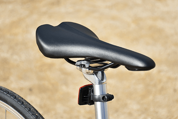 お尻の痛みの原因の一つである血流の圧迫を低減するため、中心に溝の彫られたサドル。