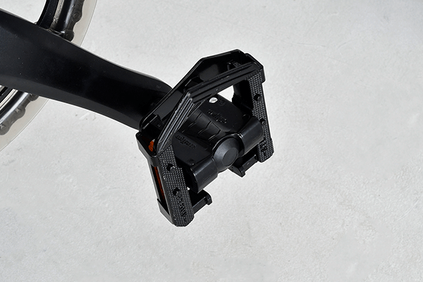 頑丈なアルミ製の折り畳み式ペダルを採用。室内での保管や輪行、車に積む際にもスペースを取らず便利。