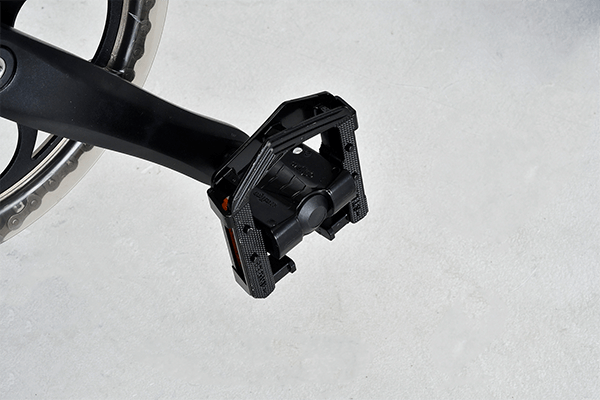 頑丈なアルミ製の折り畳み式ペダルを採用。室内での保管や輪行、車に積む際にもスペースを取らず便利。
