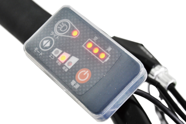 3モード(坂道・平坦・エコ)の切替ボタンでアシスト力をコントロール。バッテリー残量は三段階で表示。簡単に操作できます。