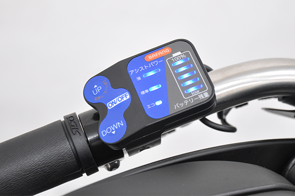 3モード(強・標準・エコ)の切替ボタンでアシスト力をコントロール。バッテリー残量は5段階で表示。オートライトのセンサーも付いています。