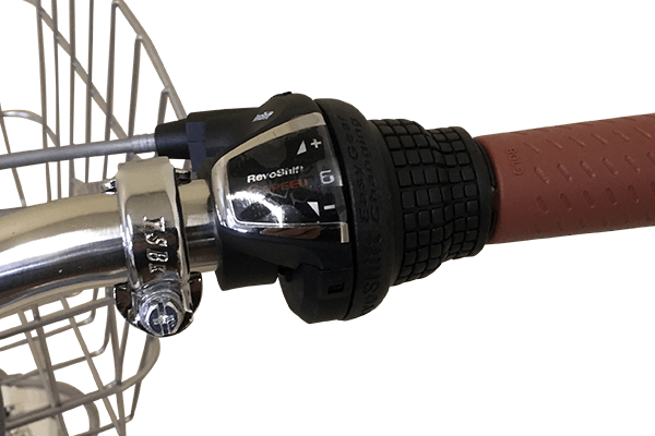 ハンドルを握ったままギアを変更できる、シマノ製のグリップシフトを採用。