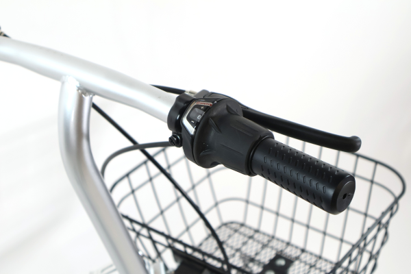 ハンドルを握ったままギアを変更できる、シマノ製のグリップシフトを採用。