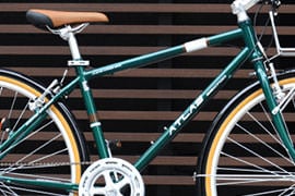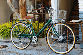 チェーンリングの大型化により、7段変速ながら長距離走行に対応。クロモリ素材の細身なデザインやレトロなカラーに加えて、便利な前カゴ付きなので通勤にぴったり。