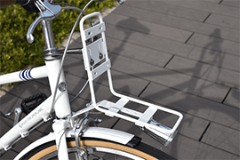 オプションでカゴの取り付けが可能なフロントキャリア。ちょっとした荷物を置きたい時に便利。