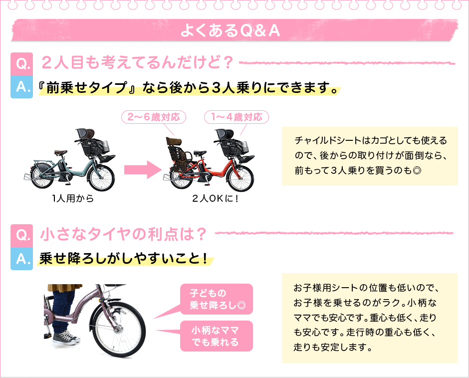 お子様が2歳を過ぎている場合は、幼稚園を卒園する6歳まで使える「後ろ乗せタイプ」がおすすめ。成長したお子様を乗せても運転しやすく、走行時の安定性が高いのが特徴です。