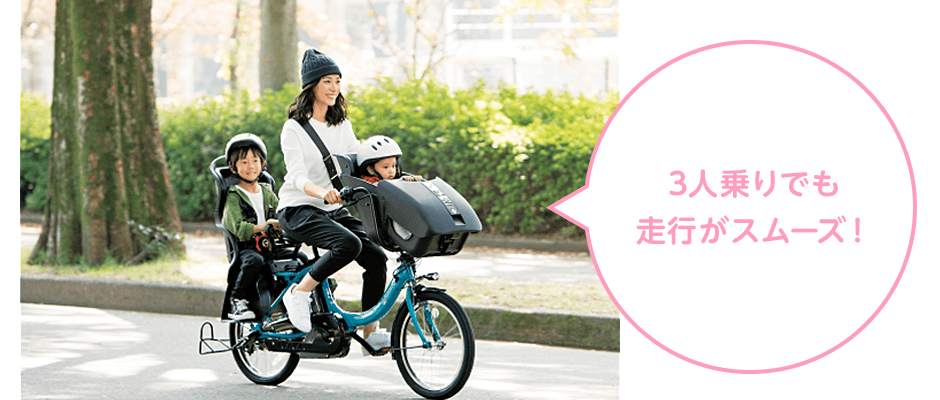 子どもが2人乗って重たくなったときでも走行がスムーズ!買い物や保育園の送迎疲れを軽減します。