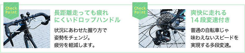 サイクリングや街中など幅広い用途で走りやすいロードバイクに充実のパーツをセット。
