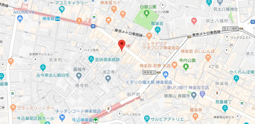 - 東京メトロ東西線 神楽坂駅(1番出口)より 徒歩1分
