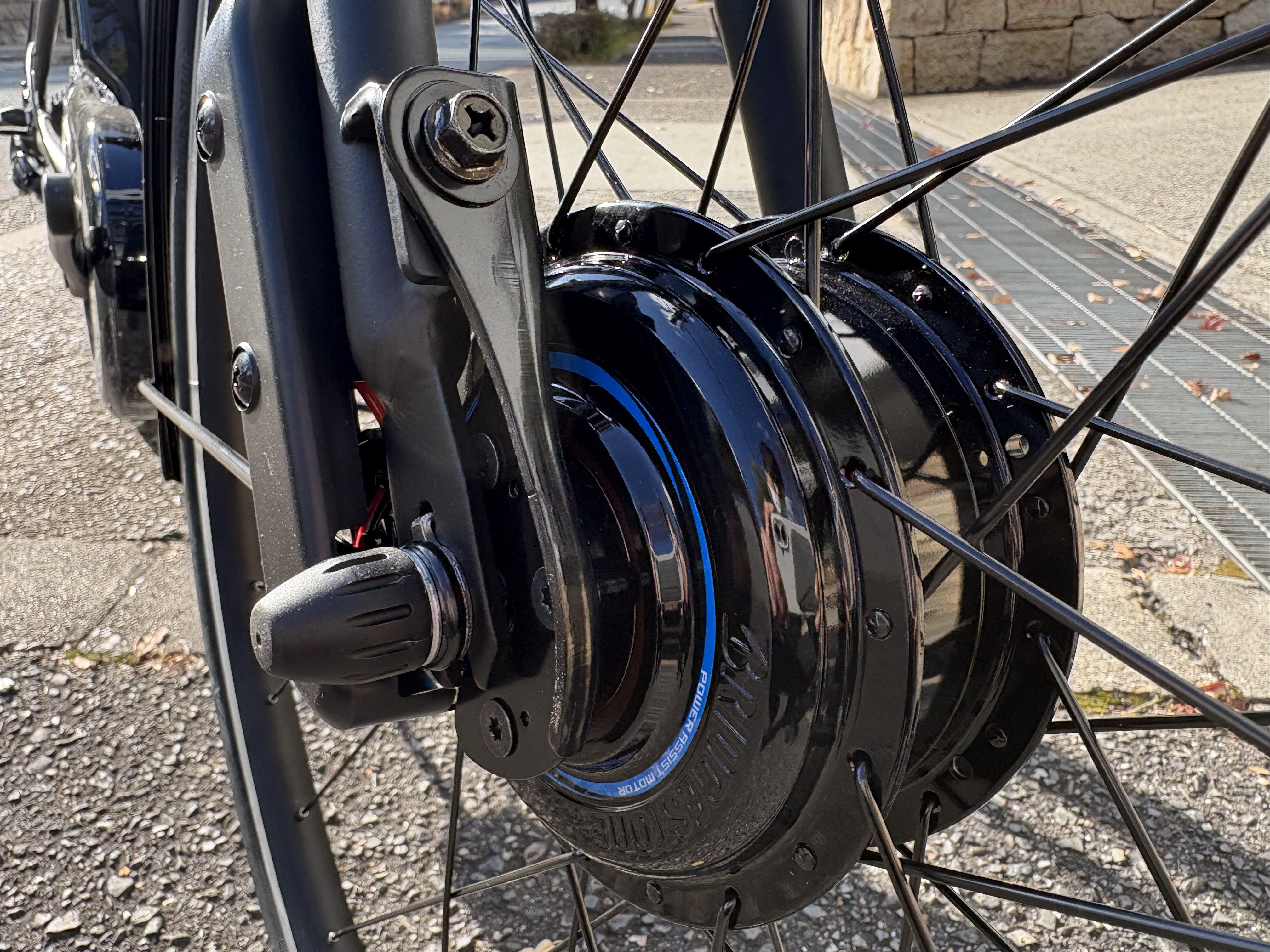 左ブレーキを軽く握ると前輪のモーターブレーキが作動し、スピードを抑制。ヒヤッとしがちな下り坂でも安心して走れます。